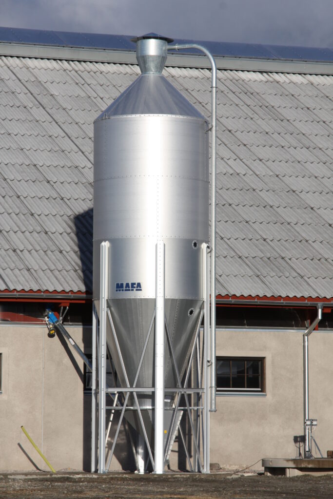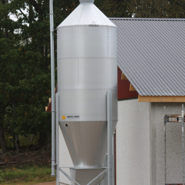 MAFA UNIK Small er en udendørs silo, udviklet til landbrugets krav om driftssikker og effektiv foderopbevaring. Siloen leveres fabriksmonteret fra MAFA i Ängelholm og er konstrueret i en højstyrke stålplade belagt med Aluzinc, som giver en dokumenteret levetid, der er væsentligt længere end traditionelle galvaniserede stålsiloer. Denne holdbarhed, understøttet af en 10-årig garanti mod gennemtæring, gør siloen til et finansielt aktiv med en lav afskrivning og en høj gensalgsværdi.
