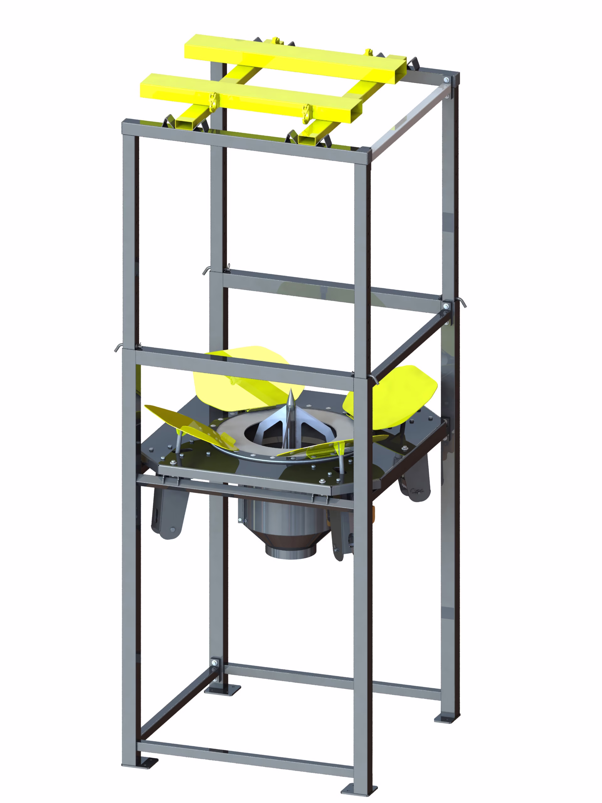 Storsækstømningsmaskine model SBB-HFF model S til håndtering af storsække med stativ. Storsækken placeres på stativet med f.eks. en gaffeltruck.