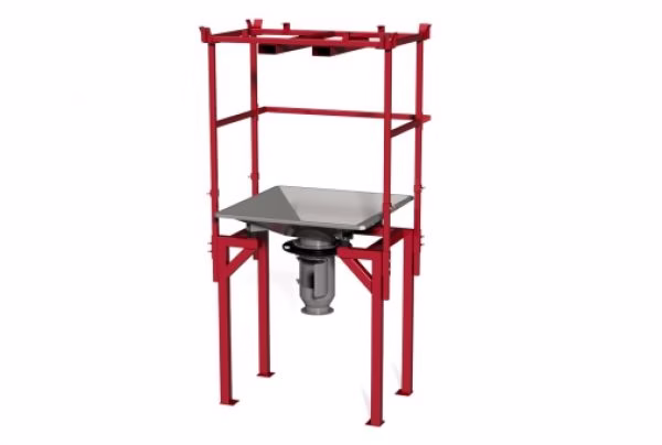 Sækkestøtte i robust design med skrå sider, som støtter sækken og letter tømningen, samt gør det muligt at påvirke sækken med vibrator under tømning, så den tømmes helt og problemfrit. Sækken skal delvist stå i sækkestøtten og delvist hænge i telferåget under tømningen for at opnå det bedste resultat.